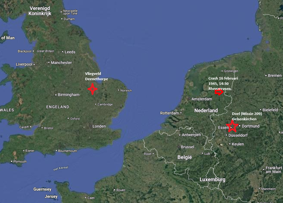 Boven Gelsenkirchen werd het vliegtuig geraakt daar een Flak afweergeschut, dit is een Duits luchtaftweer geschut; ze werden geraakt in de rechter vleugel en die begon te branden. Het vliegtuig probeerde al brandend Engeland weer te bereiken het vliegtuig gaf het op, de vleugel stond in brand en het vuur had zich al helemaal verspreid over de gehele vleugel. Het vliegtuig maakte een draai van 180 graden zodat ze niet in het Ijsselmeer terecht zouden komen, in plaats daarvan zette het koers richting Hardenberg. Tegen 14:30 explodeerde het vliegtuig in de lucht boven Rheezerveen, het Colenbranderbos. Een deel van het vliegtuig kwam terecht naast het Stoetenslagh en een ander deel naast een kwekerij, hier is de piloot overleden toen die uit het vliegtuig wou springen maar zijn parachute in brand stond. Omdat het vliegtuig explodeerde in de lucht vielen er bijna in het gehele Colenbrander bos brokstukken en delen van het vliegtuig neer.